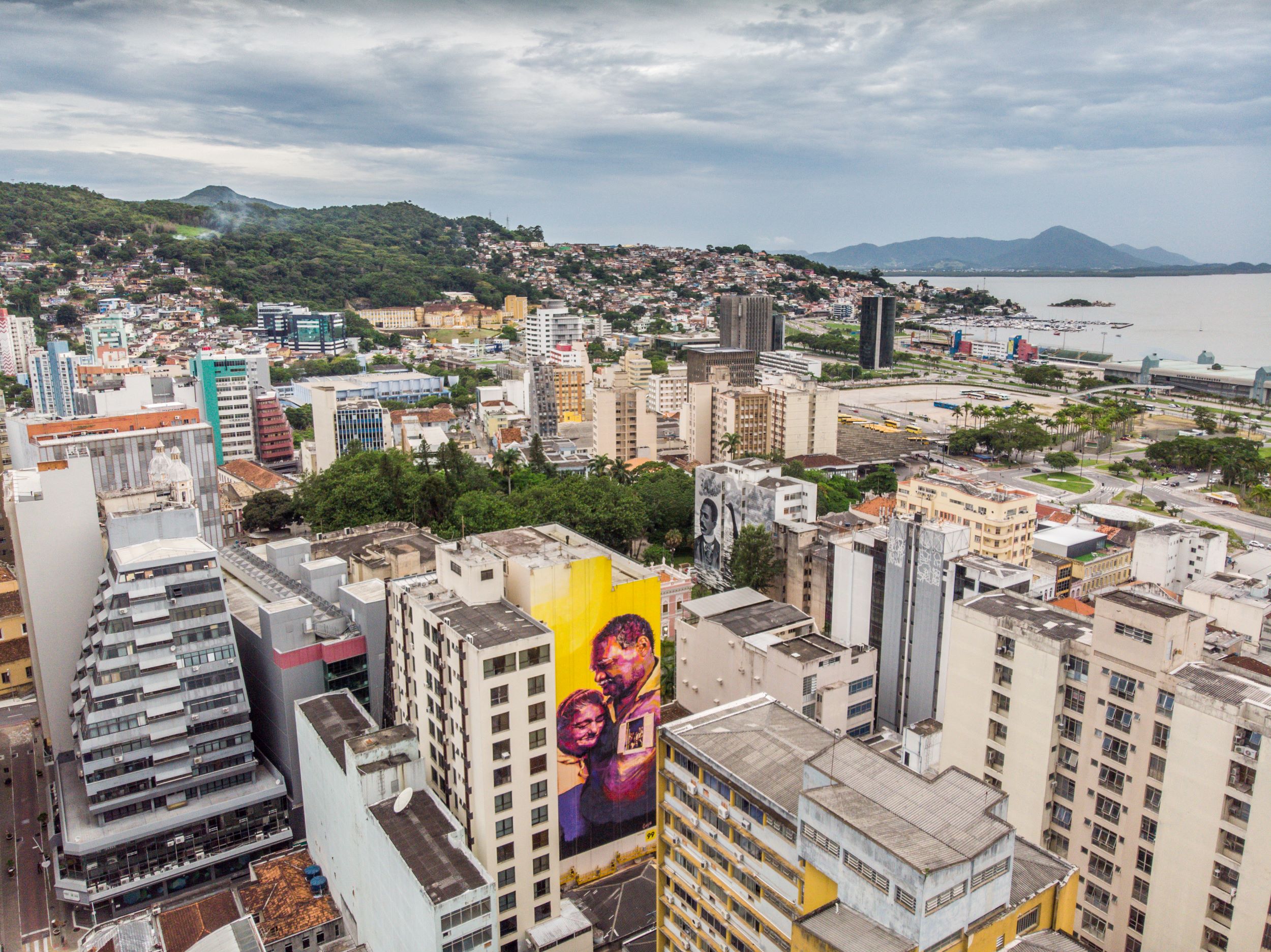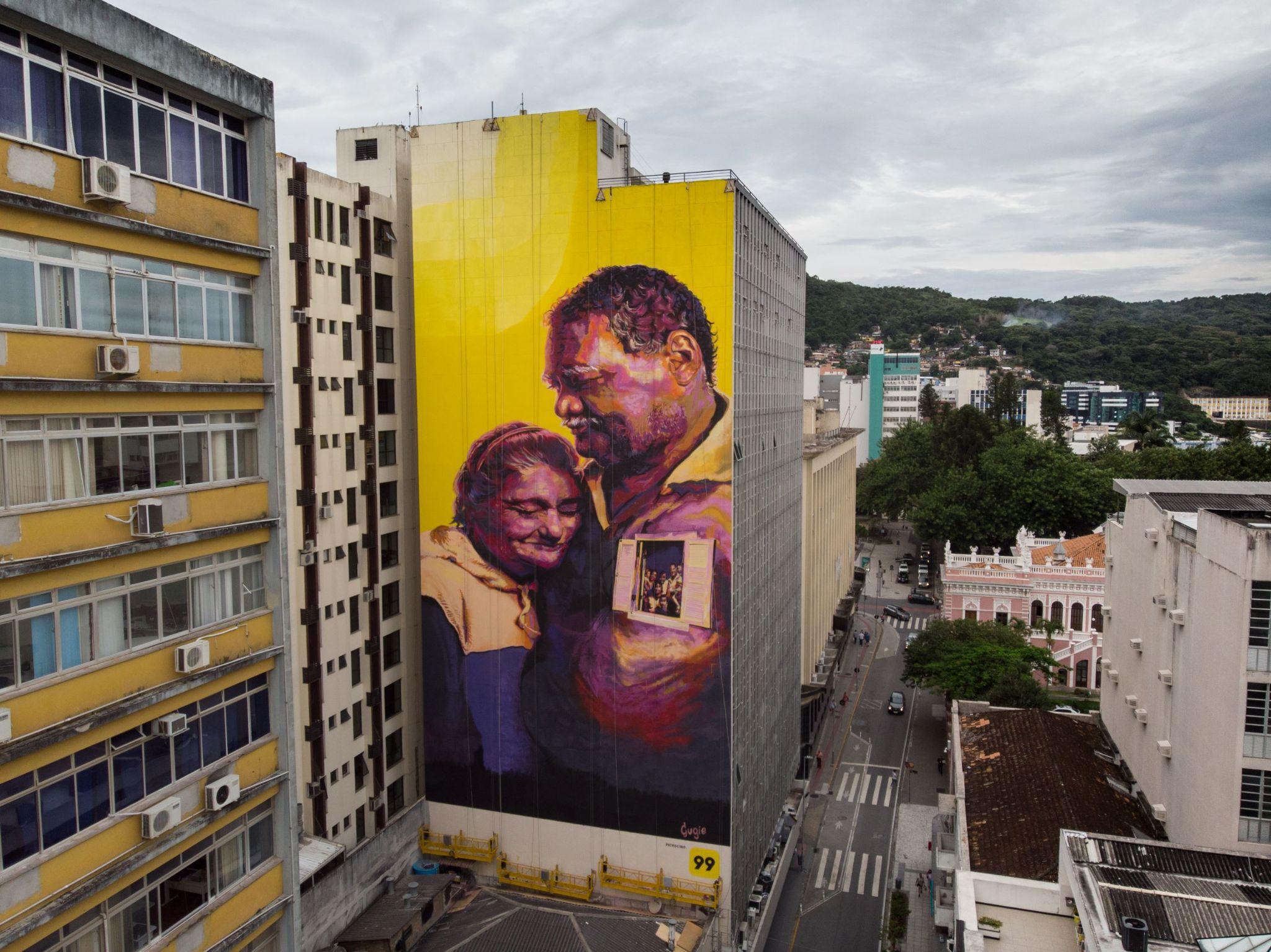 As cores vibrantes que ilustram de cima a baixo a fachada de um prédio em Florianópolis traçam as formas de duas pessoas, que apesar de anônimas, preenchem os olhos de qualquer um que, onde quer que se encontre no centro da capital para, observa, tira foto e segue sua jornada com o coração aquecido e os sentimentos mais aguçados.